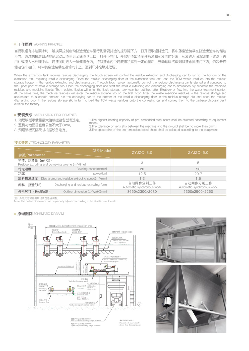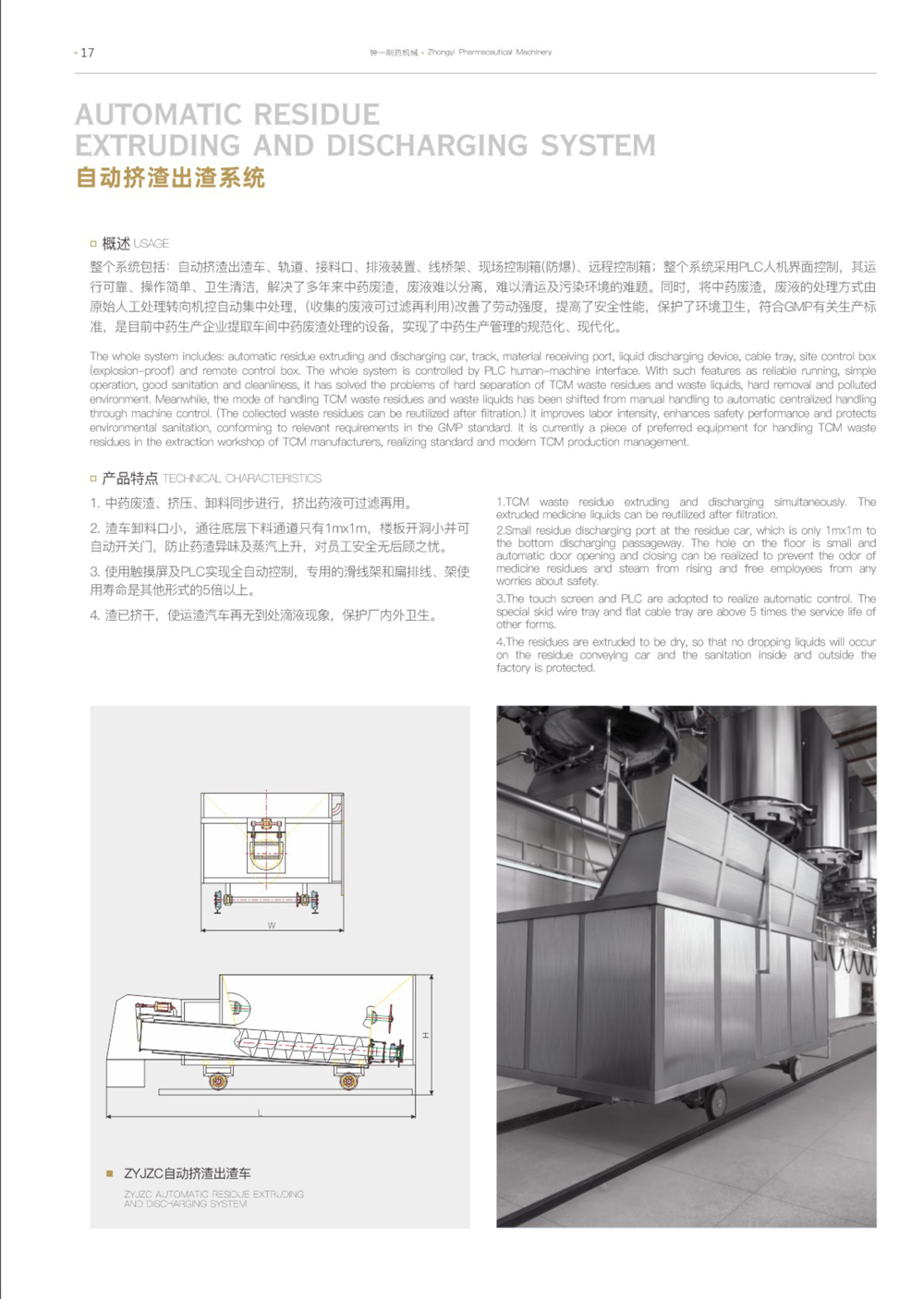 整个系统包括:自动挤渣出渣车、轨道、接料口、排液装置、线桥架、现场控制箱(防爆)、远程控制箱;整个系统采用PLC人机界面控制,其运行可靠、操作简单、卫生清洁,解决了多年来中药废渣,废液难以分离,难以清运及污染环境的难题。