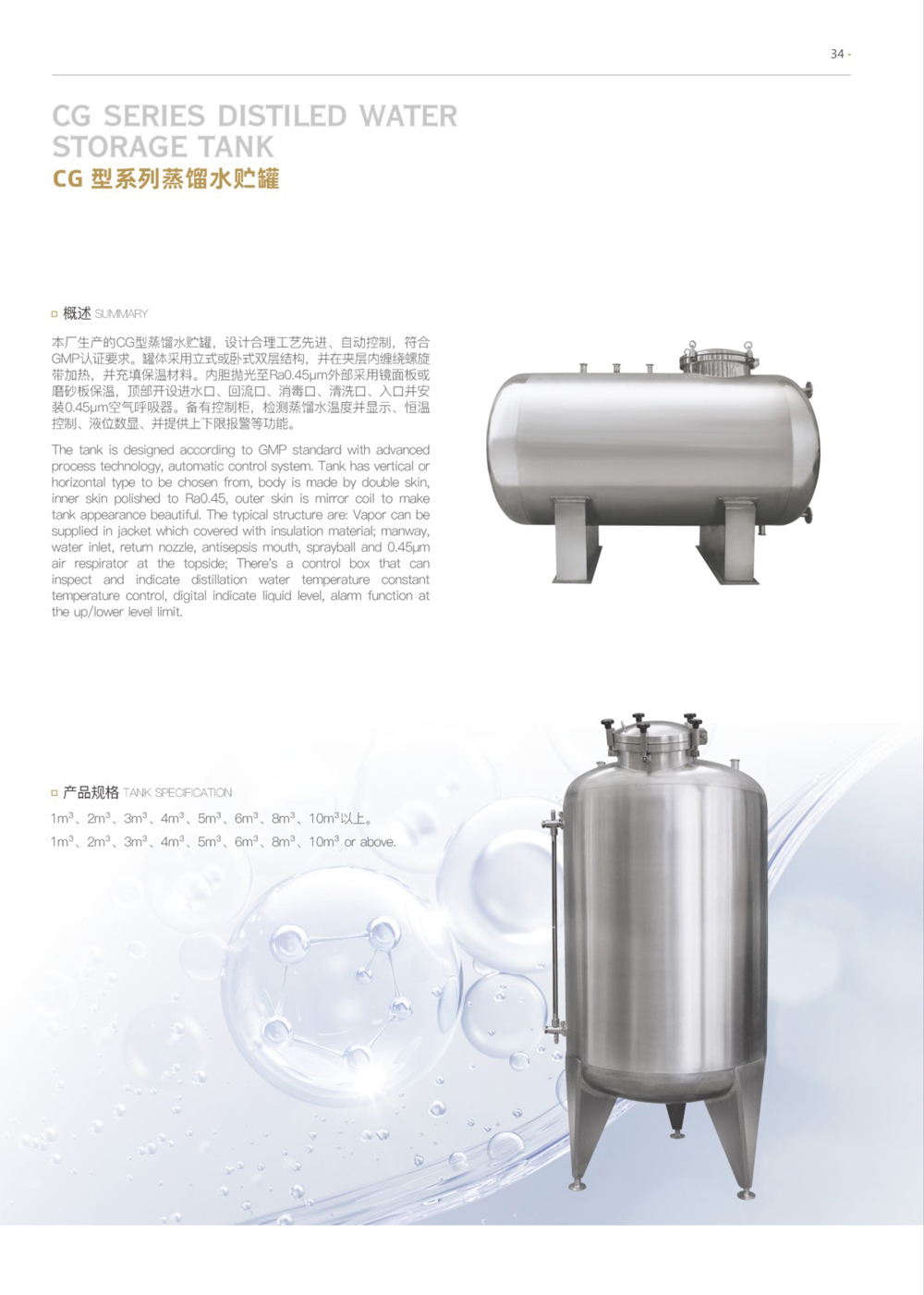 本厂生产的CG型蒸馏水贮罐,设计合理工艺先进、自动控制,符合GMP认证要求。罐体采用立式或卧式双层结构,并在夹层内缠绕螺旋带加热,并充填保温材料。