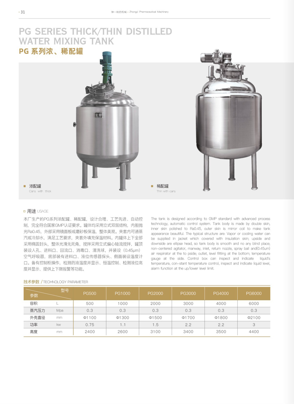 本厂生产的PG系列浓配罐、稀配罐,设计合理、工艺先进、自动控制,完全符合国家GMP认证要求。罐体均采用立式双层结构,内胆抛光Ra0.45,外部采用镜面板或磨砂板保温,整体美观。